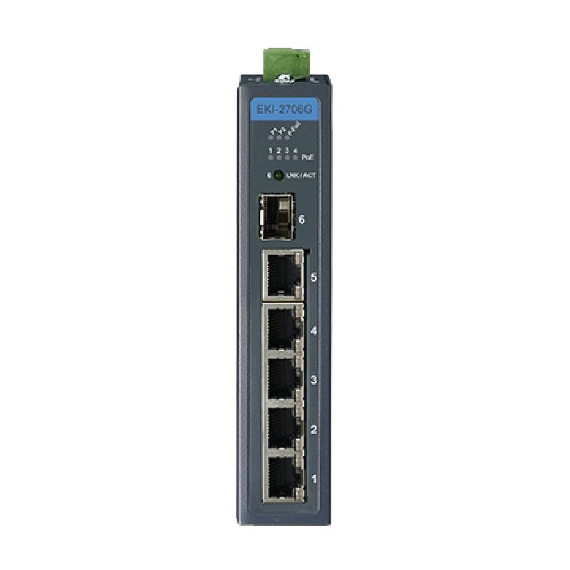- 支持10/100/1000 Mbps自適應電口(EKI-2706G)