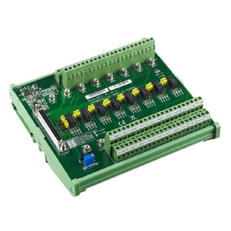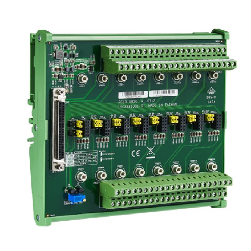 • PCLD-8810I 設計用于將多功能卡與 68 針 SCSI-II 連接器相匹配,例如 PCI-1710/1710L/1710HG/1710HGL/1711/1711L/1716/17416L/1741U/1742U 卡。PCLD-8810E 設計用于將多功能卡與 68 針 SCSI-II 連接器(如 PCIE-1810/1816/1816H 卡)相匹配。該螺絲端子板還包括冷端傳感電路,允許從熱電偶傳感器直接測量。結合軟件補償和線性化,每種熱電偶類型都可以容納。由于其特殊的PCB布局,您可以安裝PCLD-8811來構建自己的信號調理電路。